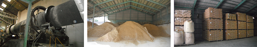 原土から製品へは、乾燥及び焼成の工程で水分と不純物の除去を行い、粉砕及び分級の工程で粒度を調整することで製品を製造しています。